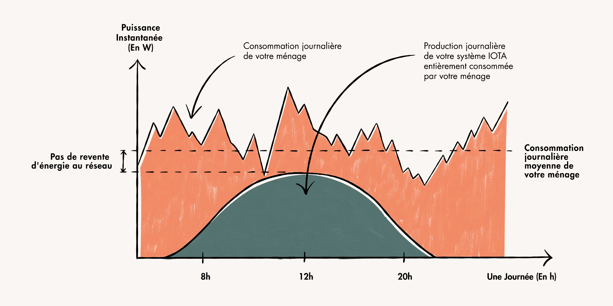 Le schéma illustre la consommation moyenne d'un ménage tout au long de la journée. La partie verte correspond à la part de consommation compensée par la production journalière de votre système IOTA.